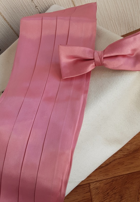Cummerbund i dimrosa, maggördel och fluga. Färgen stämmer ganska bra.