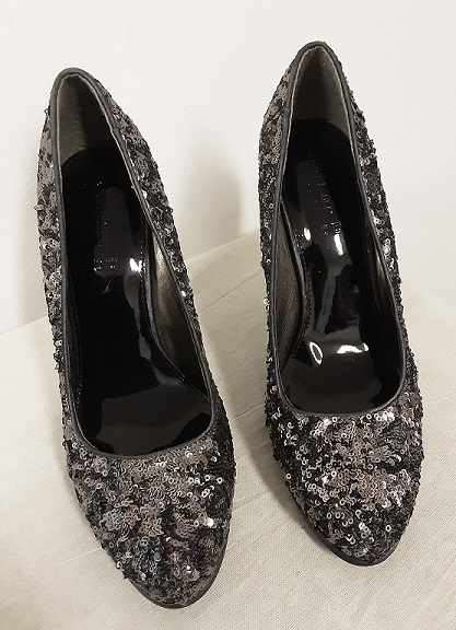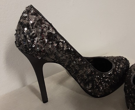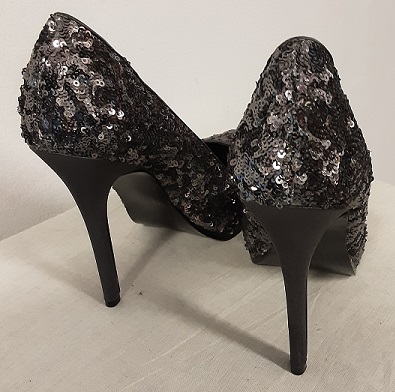 Svarta och silver paljetter på hela skon, klacken gråsvart. Märke Lovelabel. Klack höjd ca 13 cm och ca 2 cm platå. Innermått ca 25 cm. Storleks märkt 39. Helt nya oanvända.