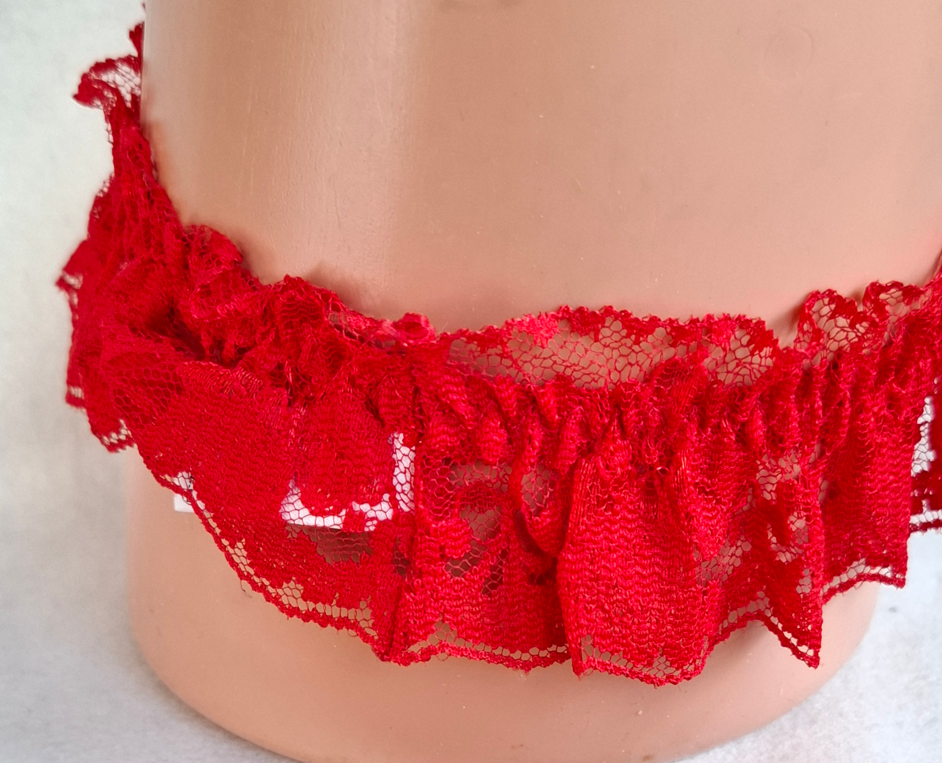 Rött strumpeband med röd rosett. Storlek ca 32 cm, men går att sträcka ut till ca 44 cm. Bredd ca 5 cm. Helt nytt.