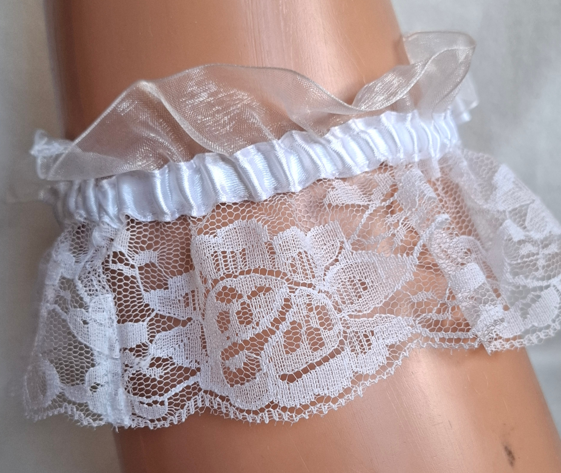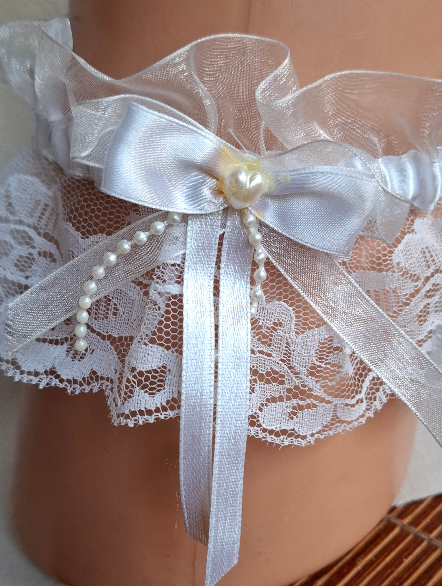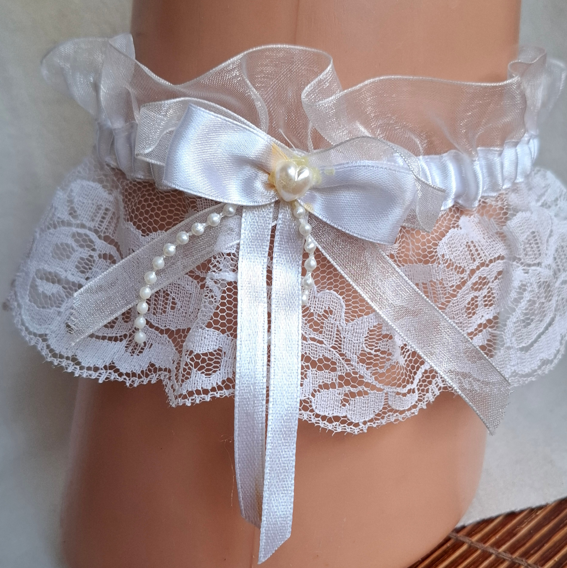 Vitt strumpeband med vit rosett och pärlor. Storlek ca 33 cm, men går att sträcka ut till ca 50 cm. Bredd ca 9 cm. Helt nytt.